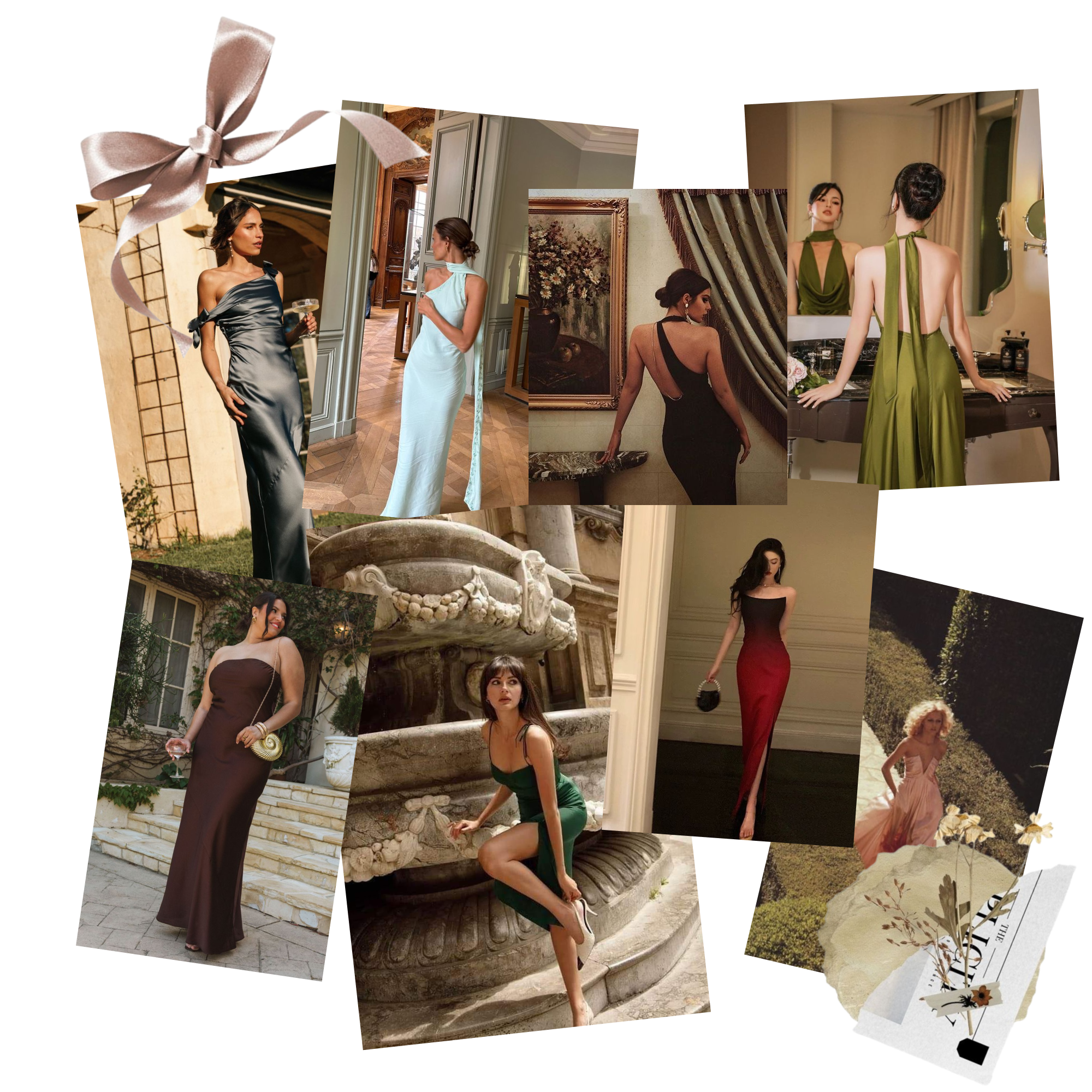 Choose a floor length dress or an elevated cocktail dress that makes you feel *opulent*. Look for neutrals, earth tones, blacks, light/muted colors, or deep jewel tones.